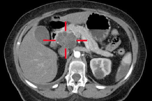 சி.டி ஸ்கேனர் பிரிவு, ஒரு மாறுபட்ட ஊடகத்தின் நரம்பு ஊசி போட்ட பிறகு, கணையத்தின் தலைப்பகுதியில் ஒரு அடினோகார்சினோமா புற்றுநோய் கட்டியைக் காட்டுகிறது.